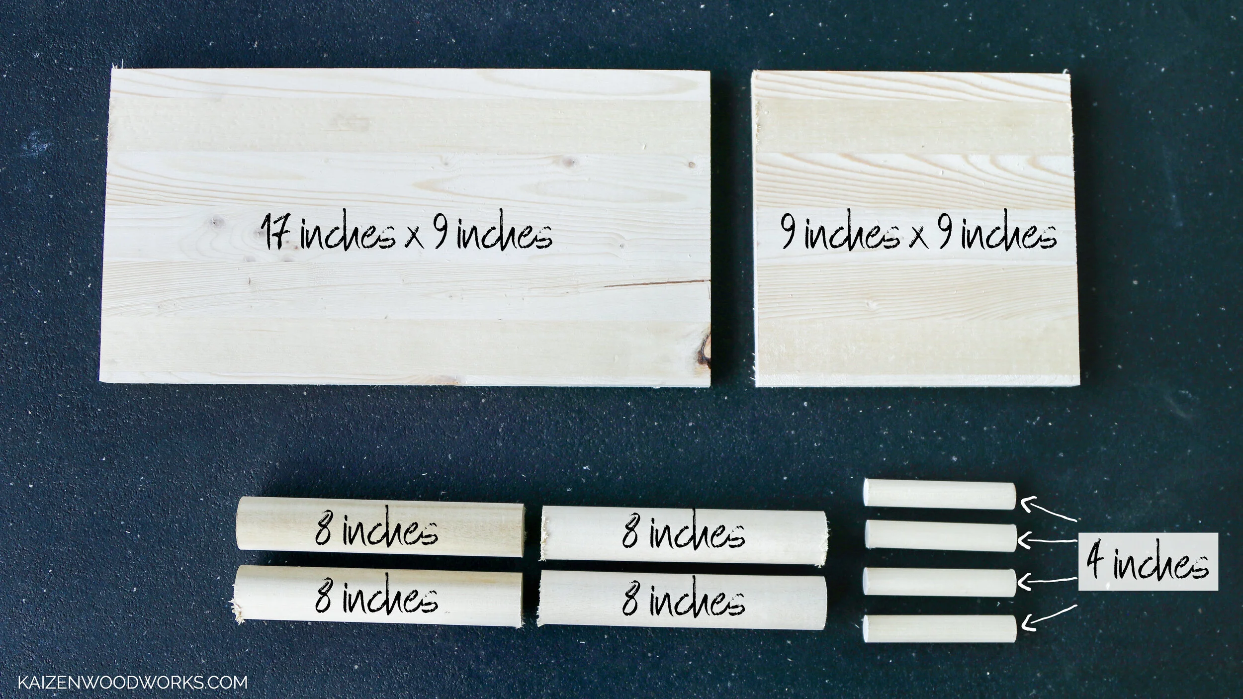 Cut the 1.5” poplar dowel into four 8” pieces, and the 3/4” dowel into four 4 inch pieces.
