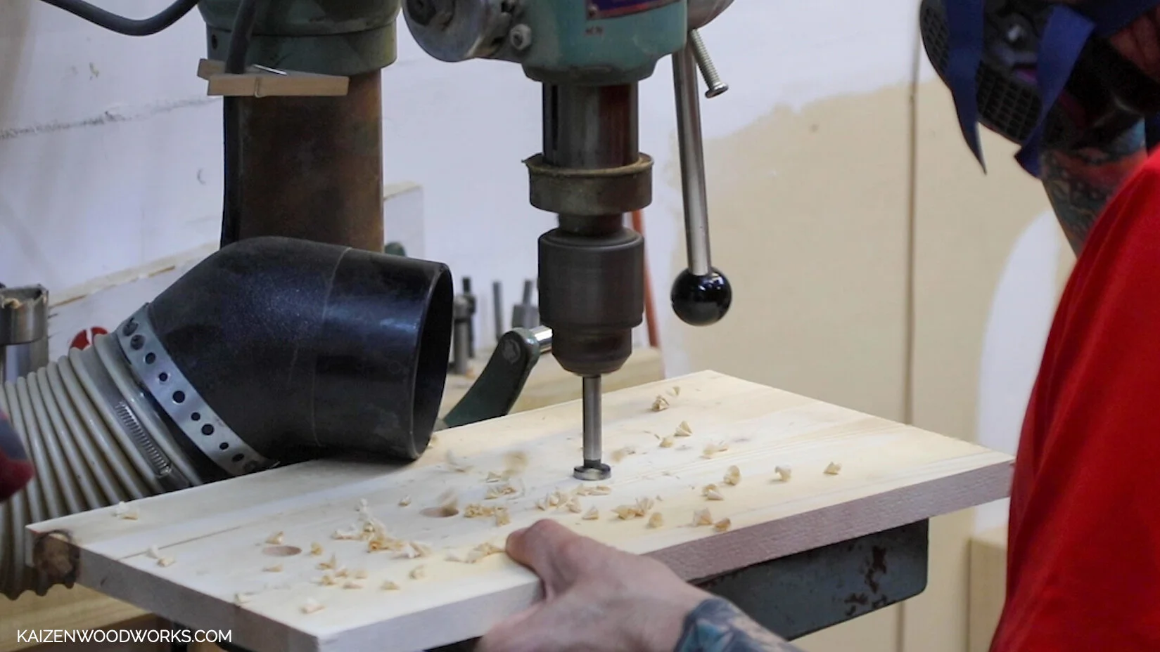 Use the same 3/4” forstner bit to drill four holes into the center of the 17” x 9” piece of pine. All the holes are along the center and equally spaced 4” apart.