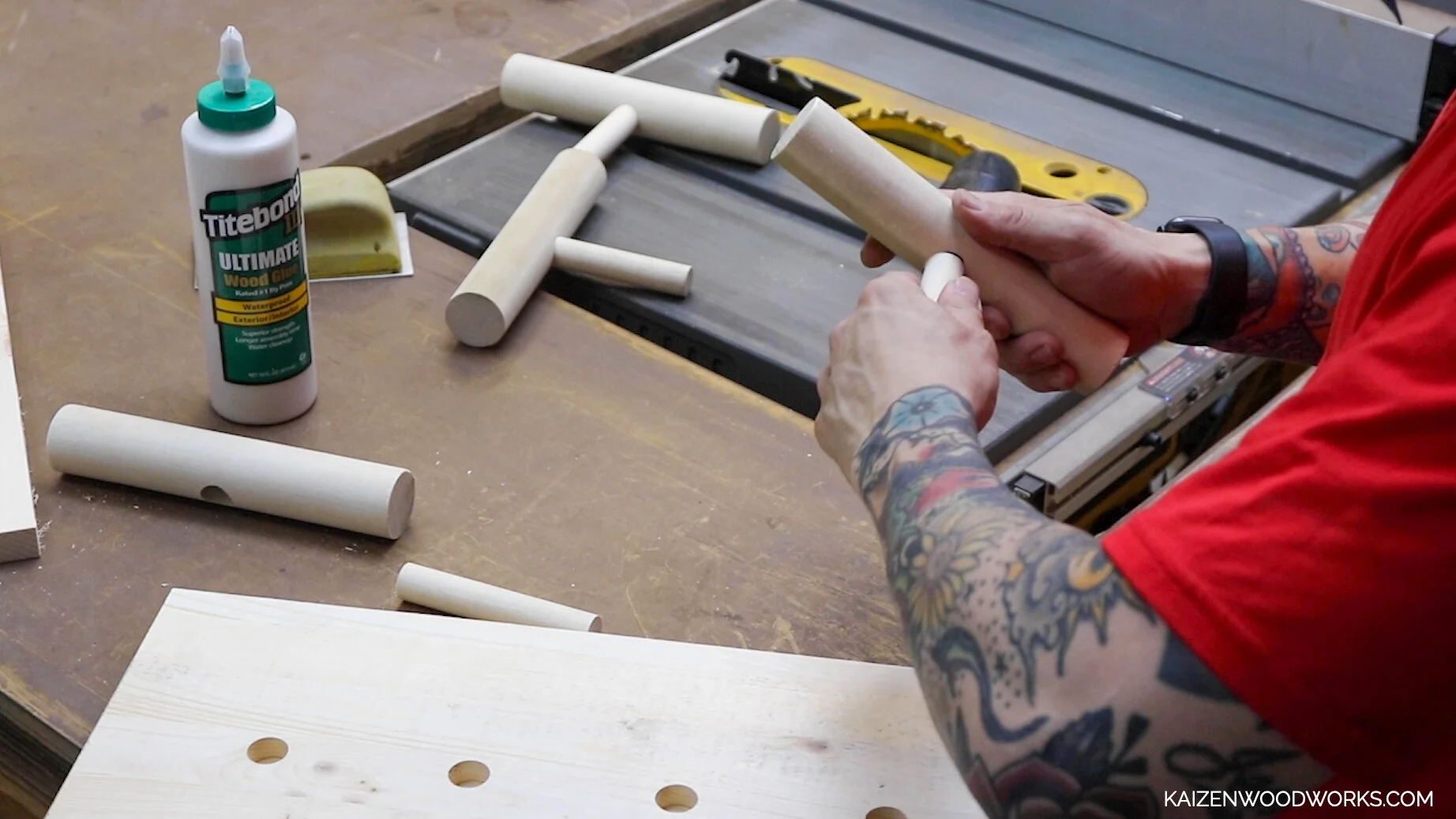 Add a little bit of wood glue before inserting the 3/4” dowel pieces into the holes in the 1.5” dowel pieces.