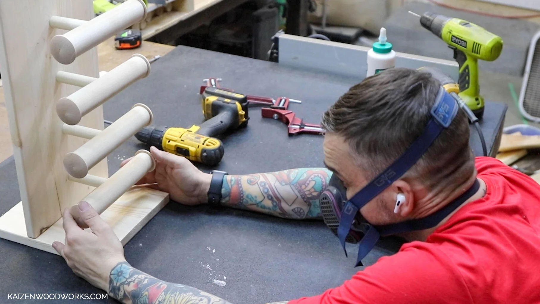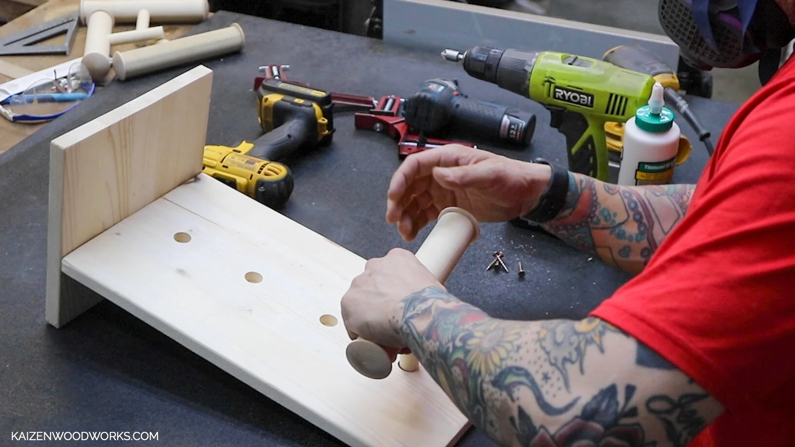 I use a 3/4” forstner bit to drill holes into the center of the 1.5” dowel pieces.
