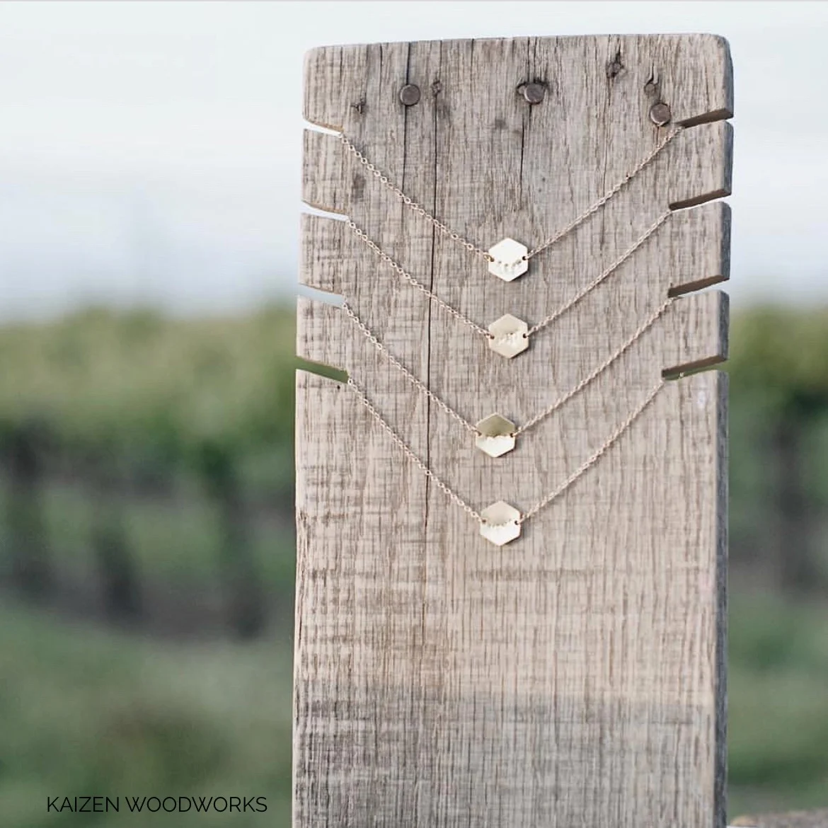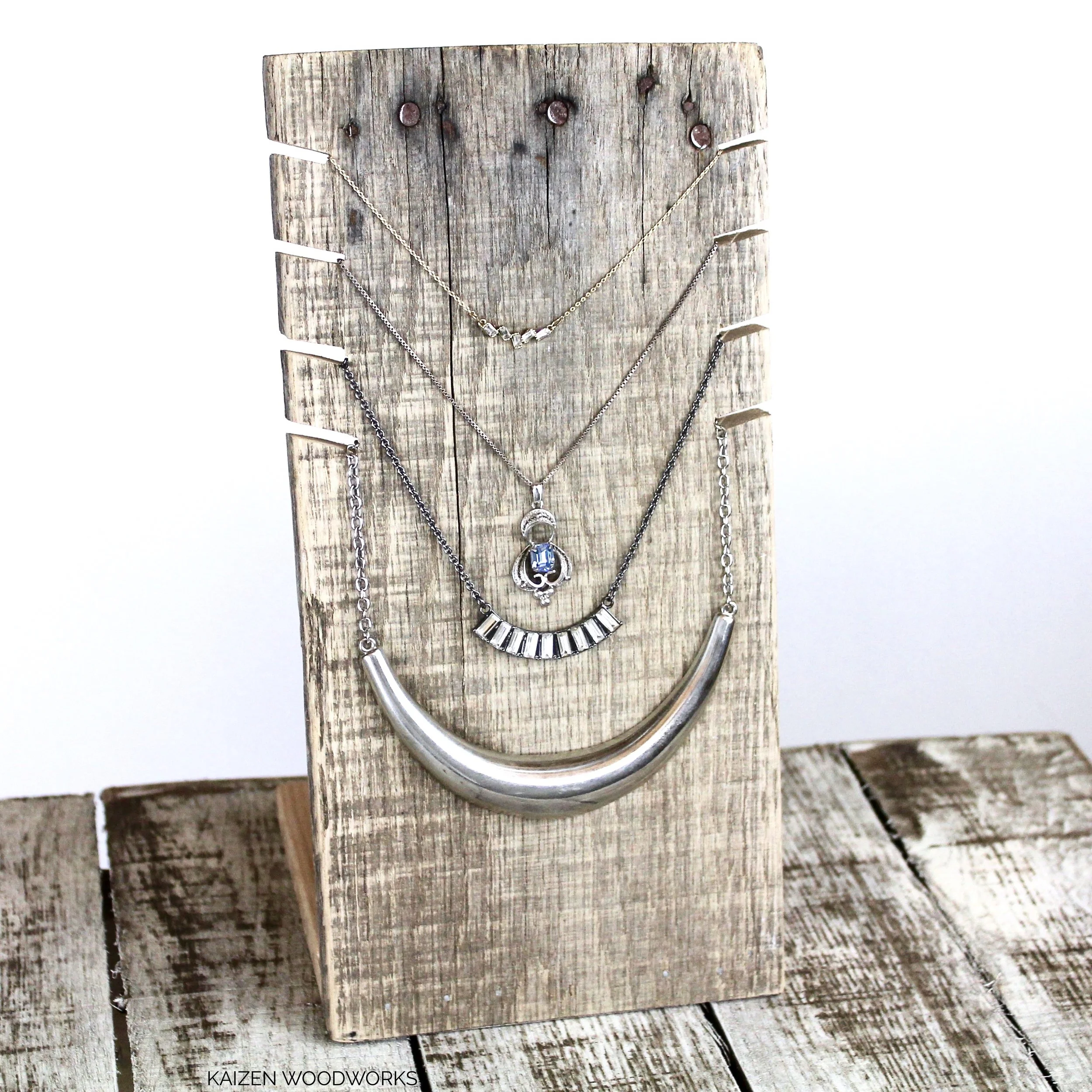 I acquired a small batch of old fence wood that I ended up using to make some slotted necklace displays. Each one was beautiful and unique. On the initial displays I used a table saw to cut the slots. I eventually moved to using a CNC because of efficiency and precision. If you want to make this, I have a tutorial and free svg design cut files so you can make yours!