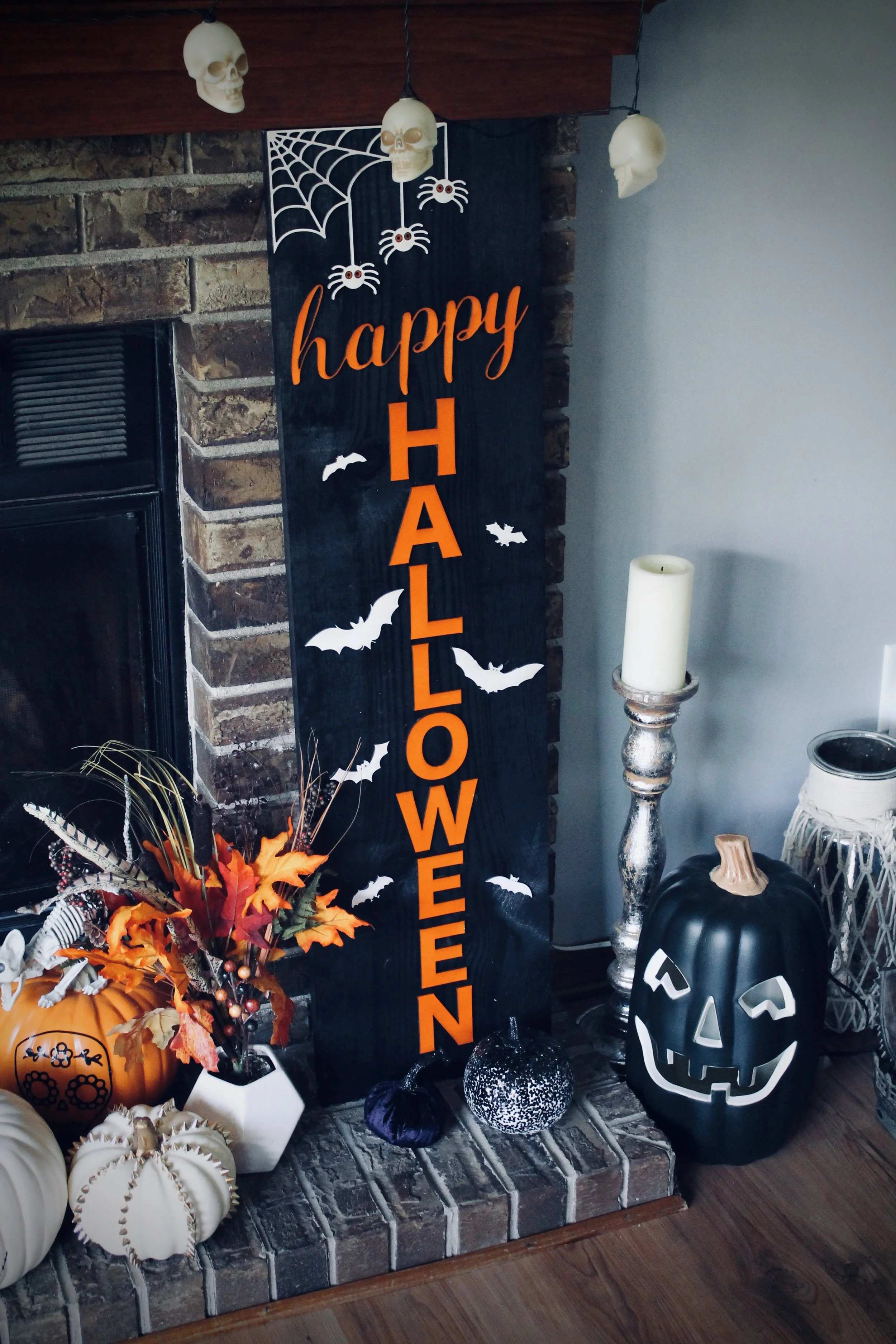 The idea for this came from other Halloween signs I found on Pinterest. For mine, I used a 12” x 36” pine panel to attach all of the pieces to. I cut out all of the letters and shapes out of wood with my laser cutter. If you don’t have a laser, these shapes can be cut out of vinyl with a Cricut or Silhouette machine, another option is to hand paint the shapes. I used the mighthype font for the word happy, and hiragino kaku gothic font for halloween. The spider web and the bats I found doing a google image search.