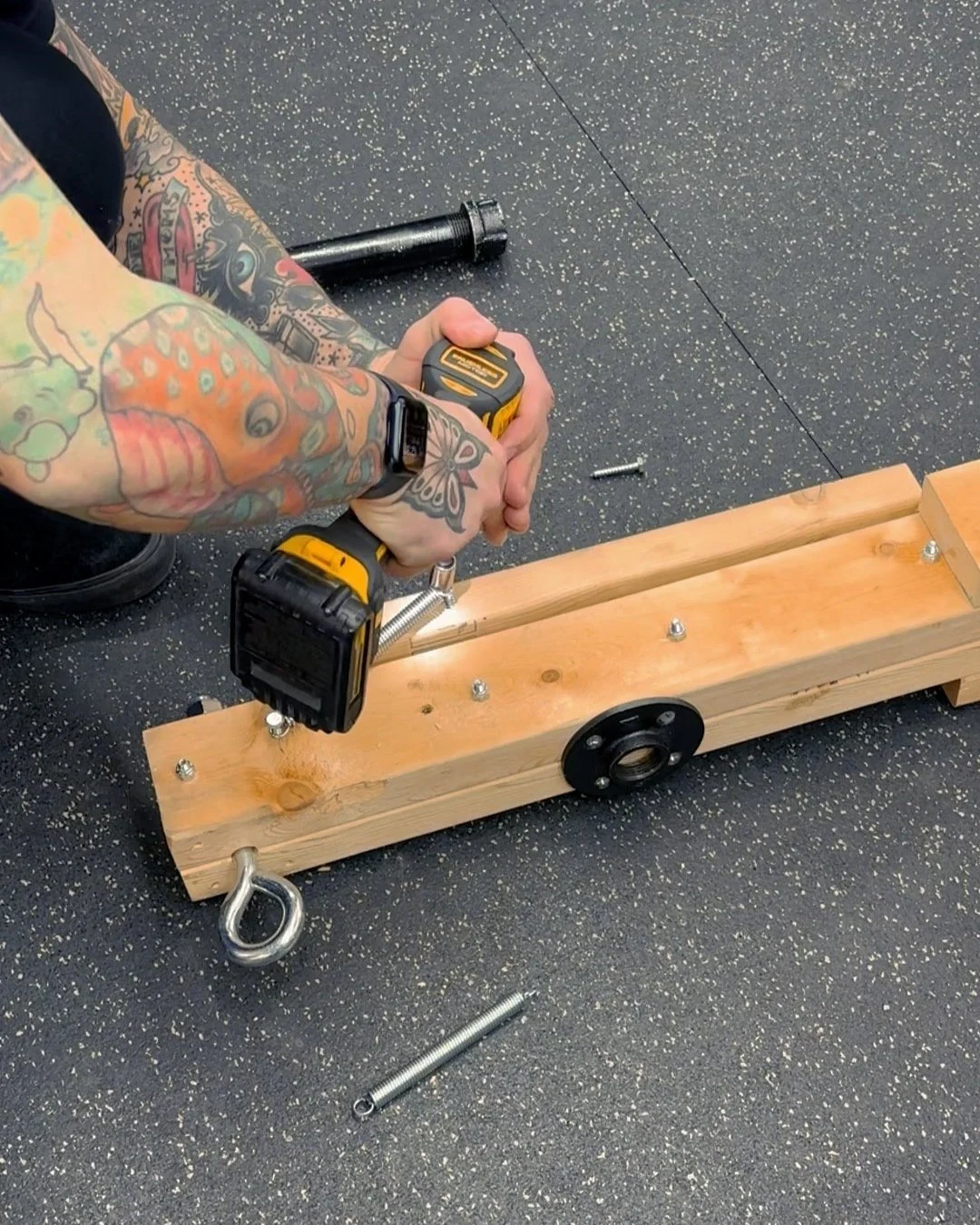 Attach a spring on each side using lag bolts.