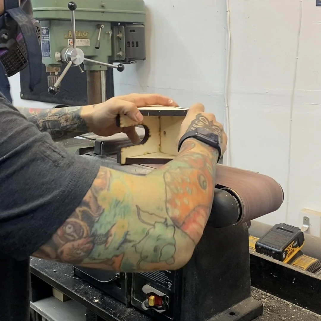 After allowing the glue to dry overnight, I use the belt sander to even out the sides. I use my table router with a round over bit to soften the edges.