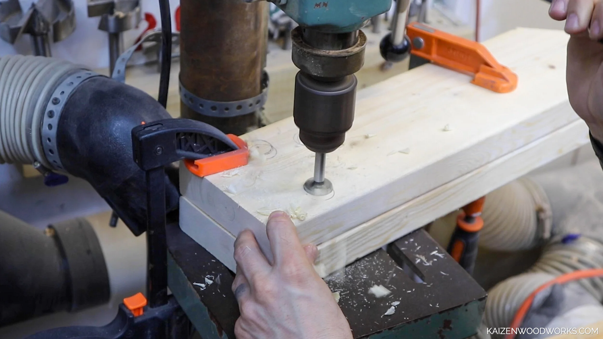 I clamp both 2x6 pieces together and then clamp them to my drill press. I use a 1 inch for forstner bit to drill the holes.