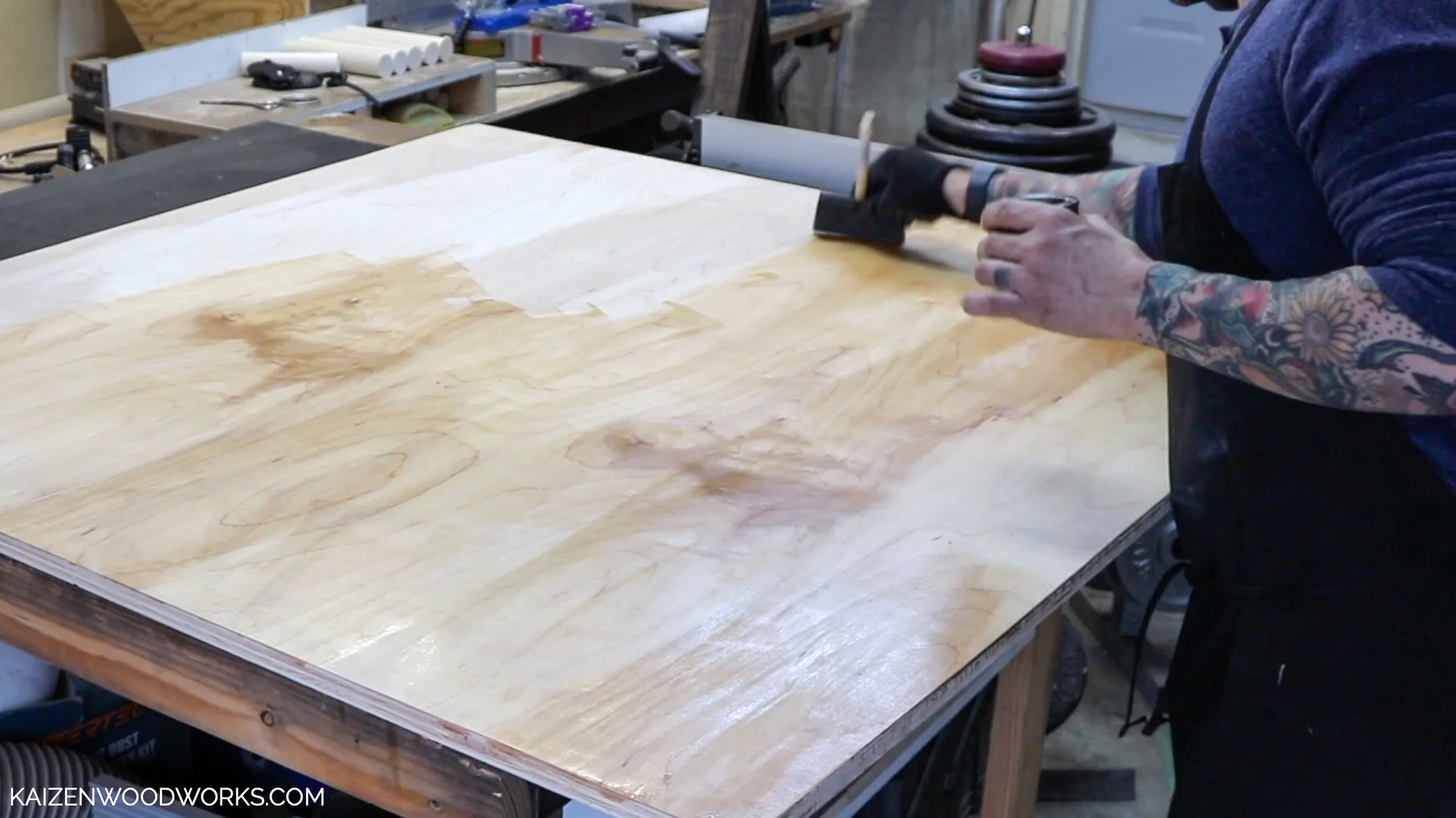 After finally cutting my maple plywood in half, I sanded out the scuffs, softened the edges, and applied a coat of polyurethane to the top. I let that first coat dry overnight before applying the second coat of polyurethane.