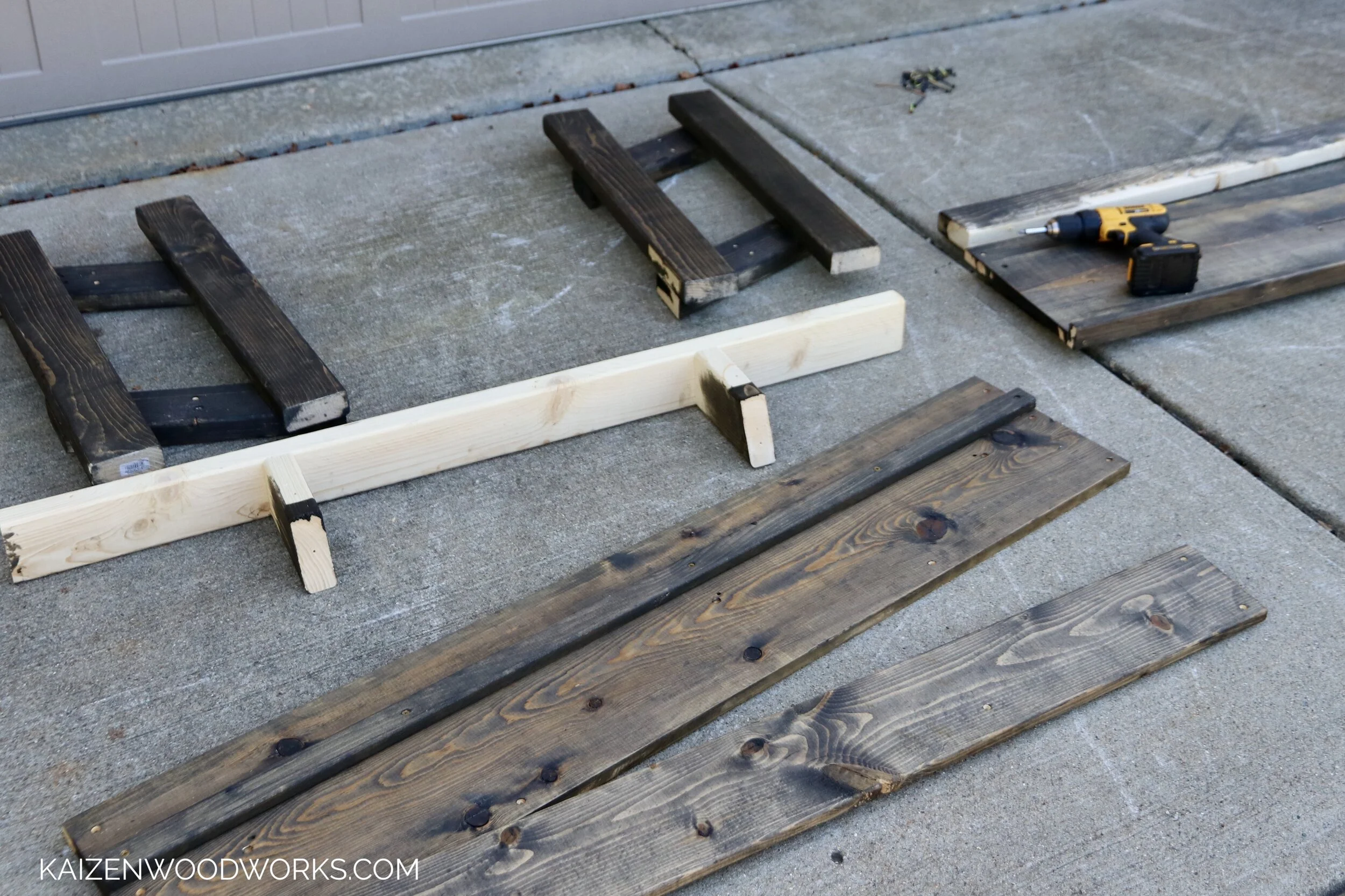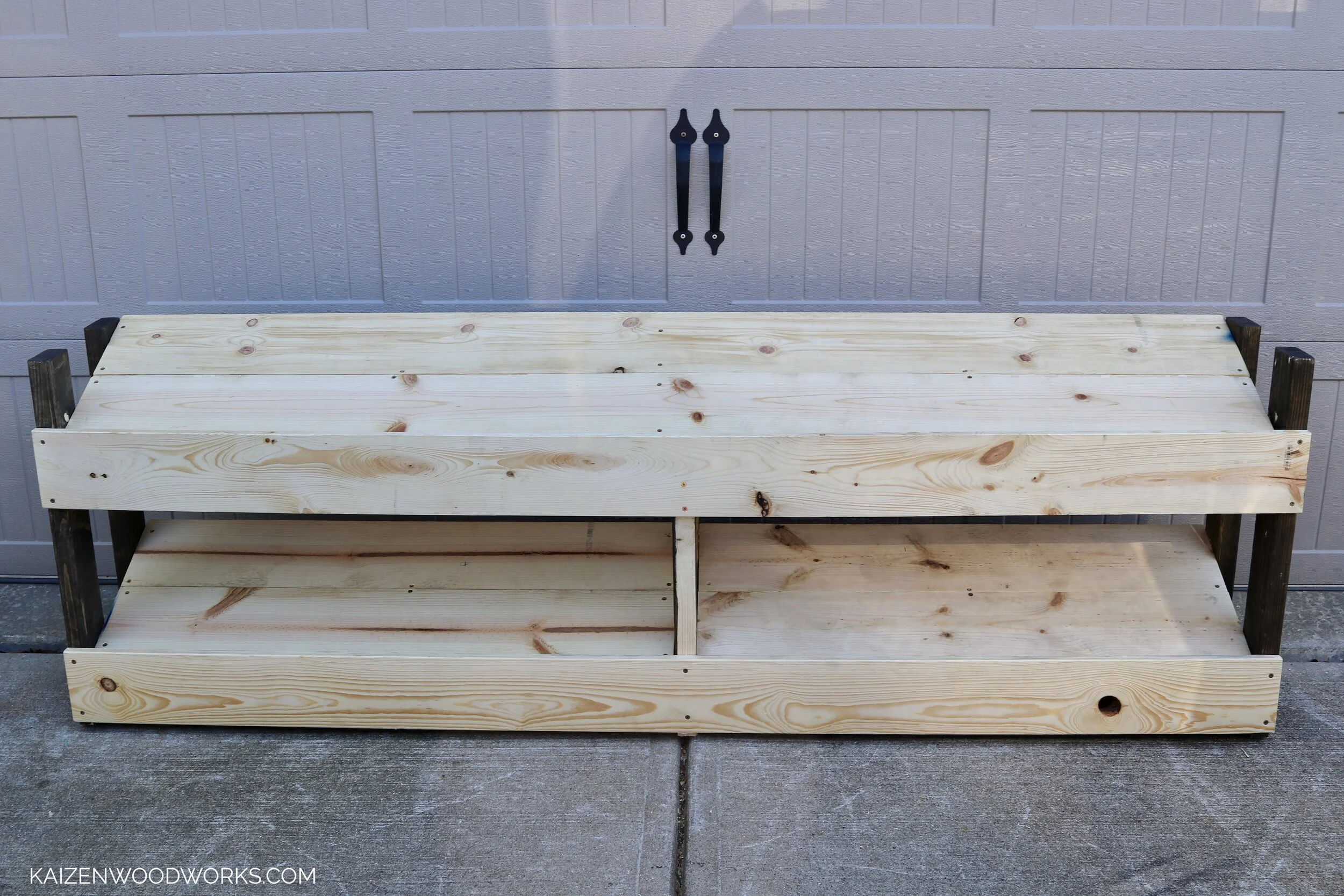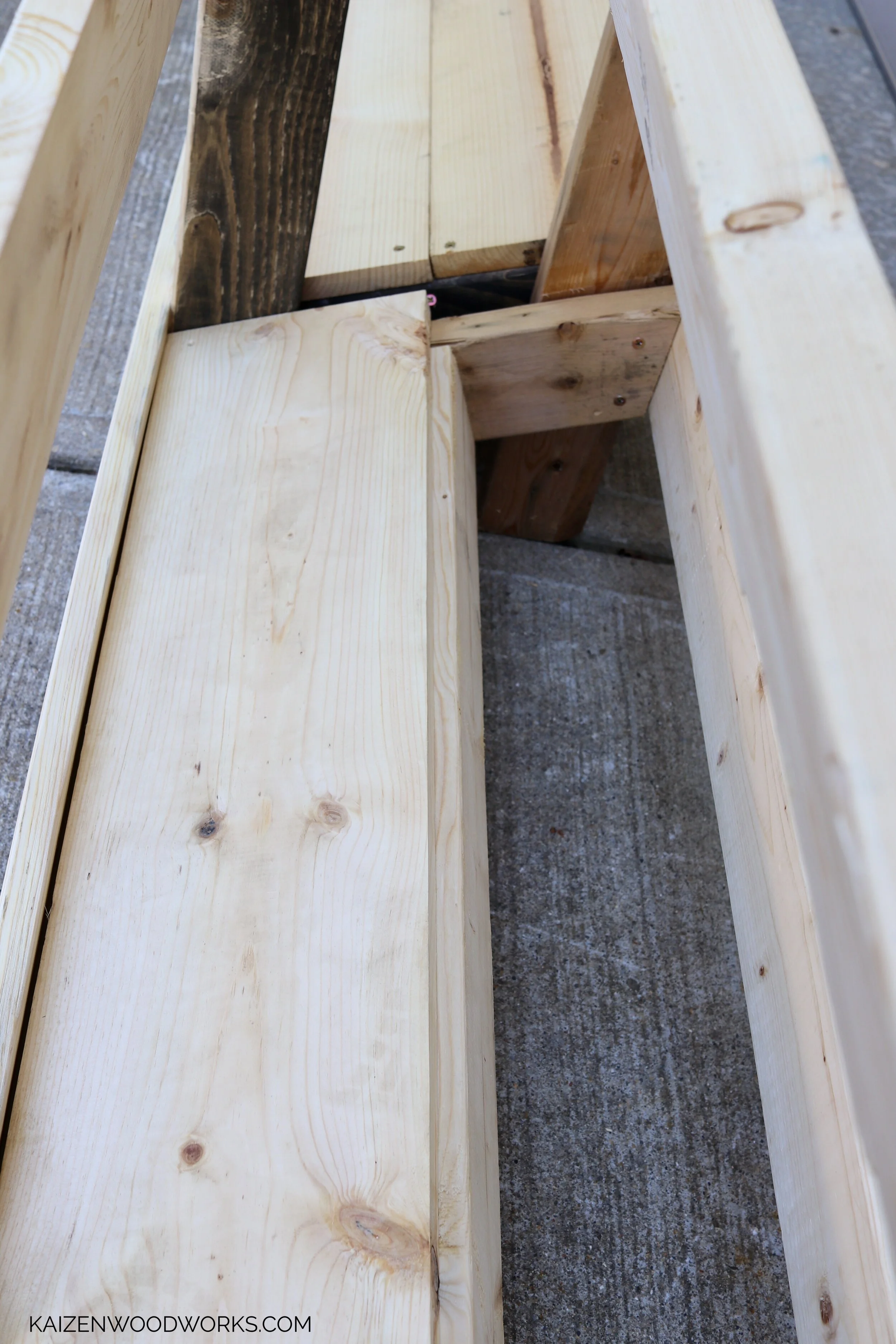 On this version I decided to increase the width of the shelves. I used 1”x8” boards, which have an actual width of 7.25”, I lined up the 2x4 on the underside on the seam of where the 1x8’s meet.