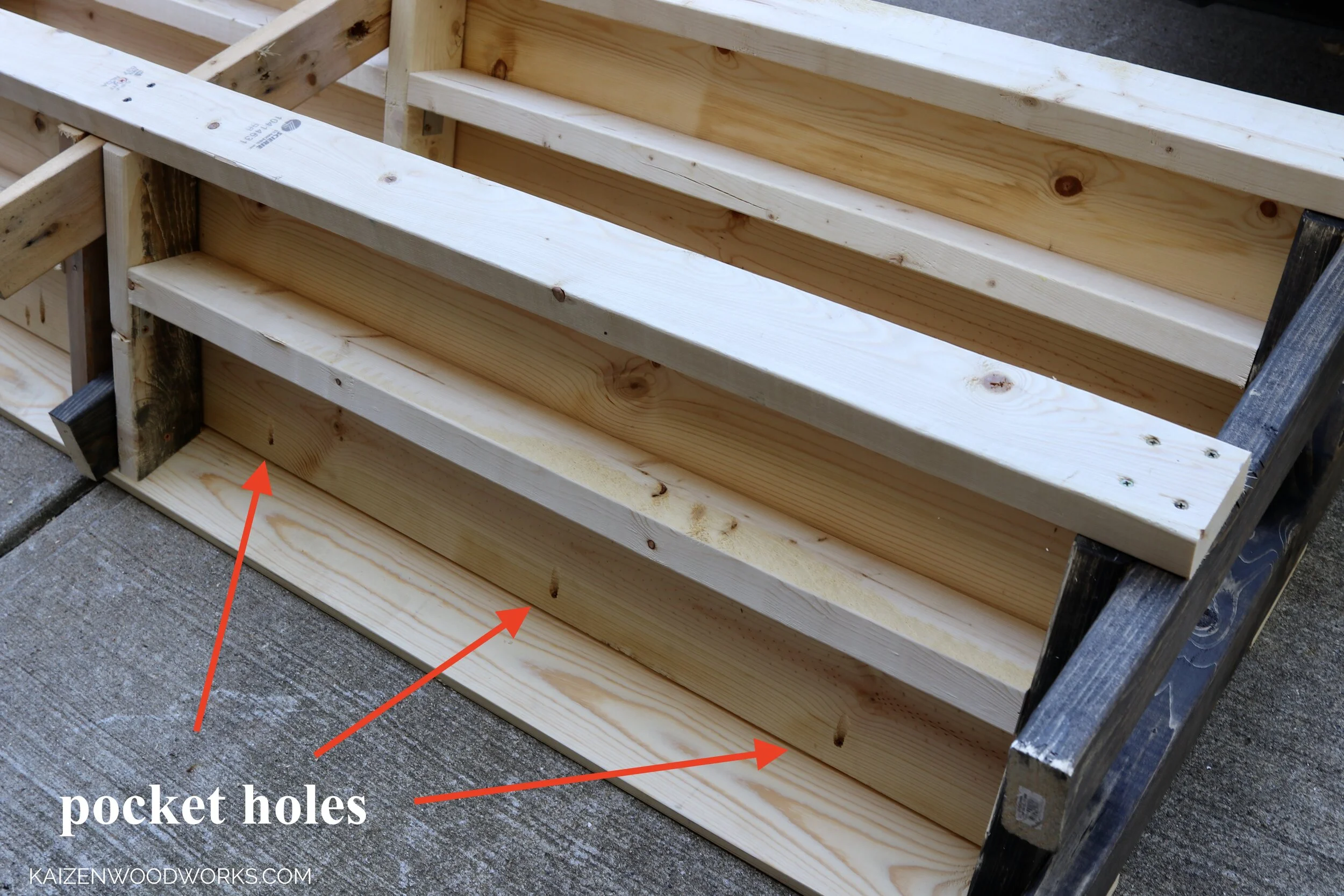 I added some pocket holes under the shelving to attach to the front 1x6’s