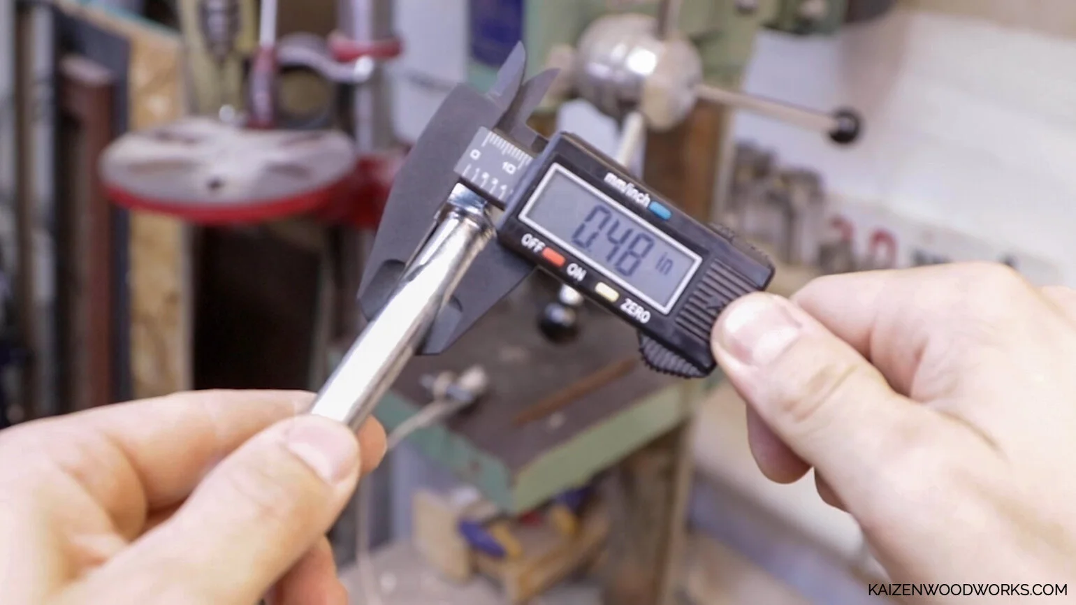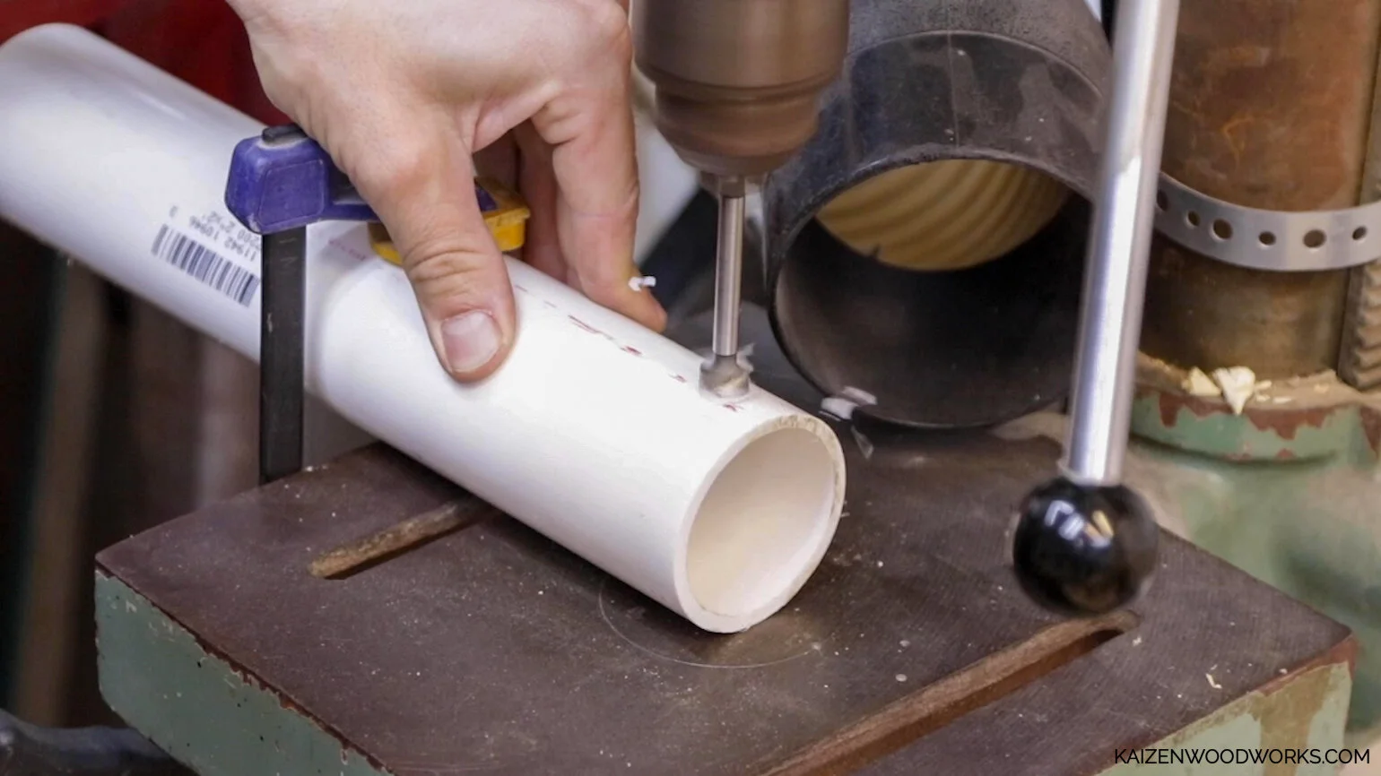 I measure the bolt with a caliper, it’s just under 1/2 an inch, so I use a half inch forstner bit with my drill press. Any half inch drill bit will work for this step. If you don’t have a drill press, you can use a cordless drill.