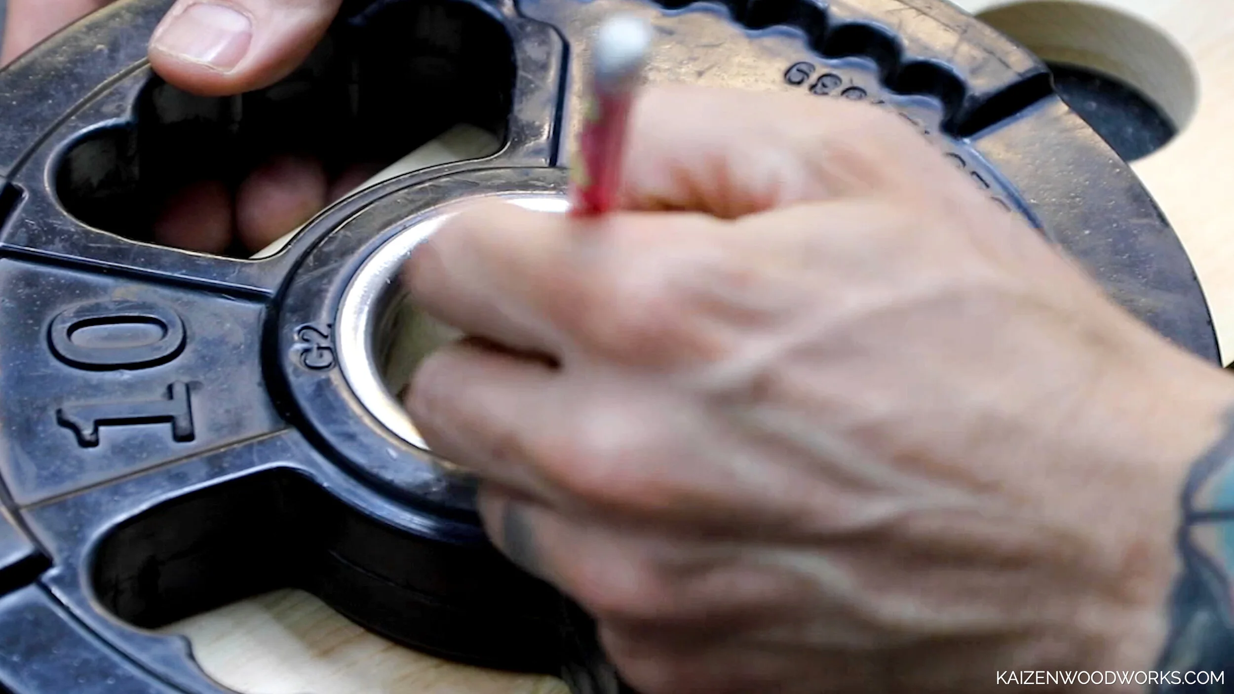 I use a 10 pound weight plate to figure out where my dowels should go.