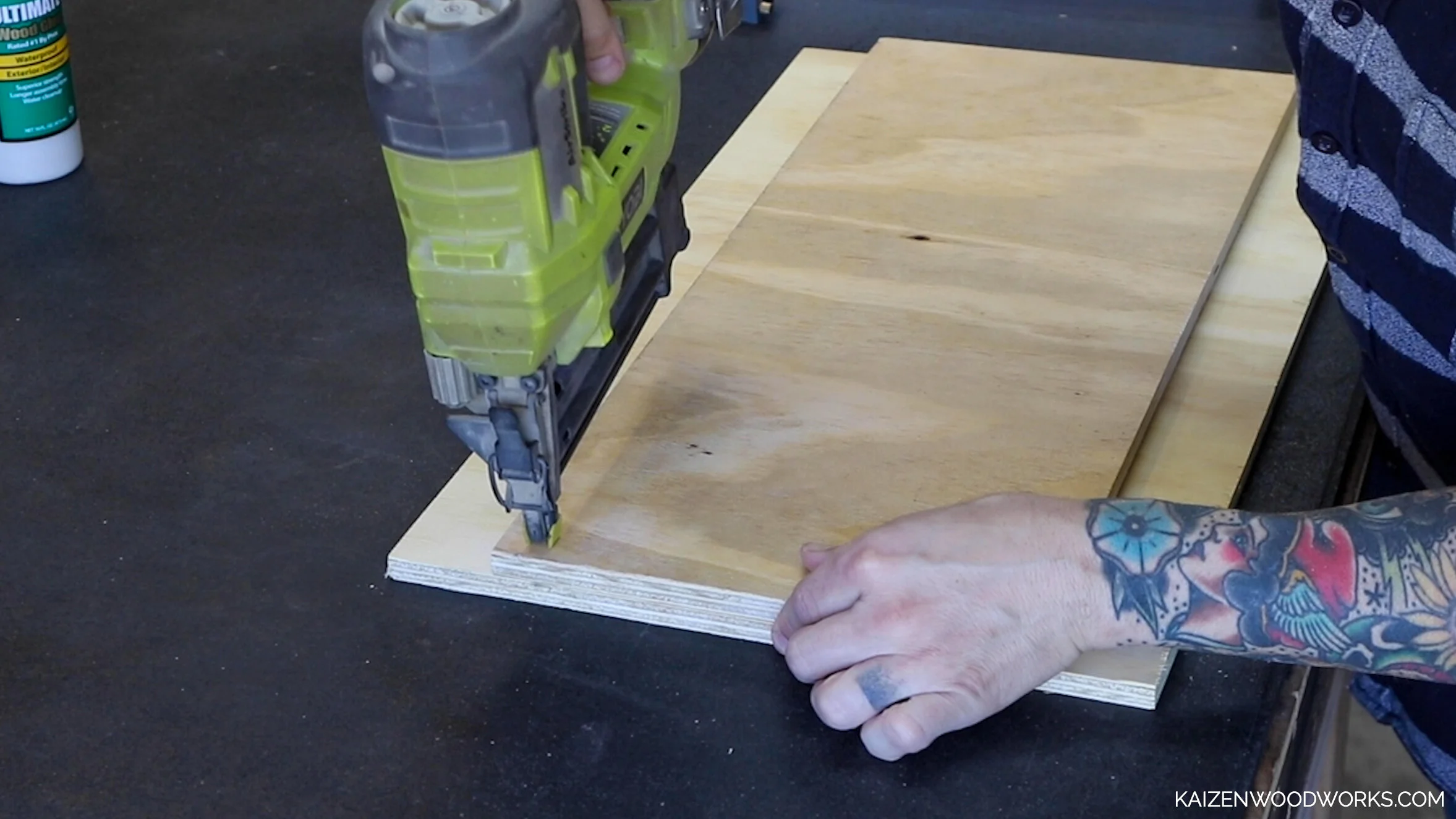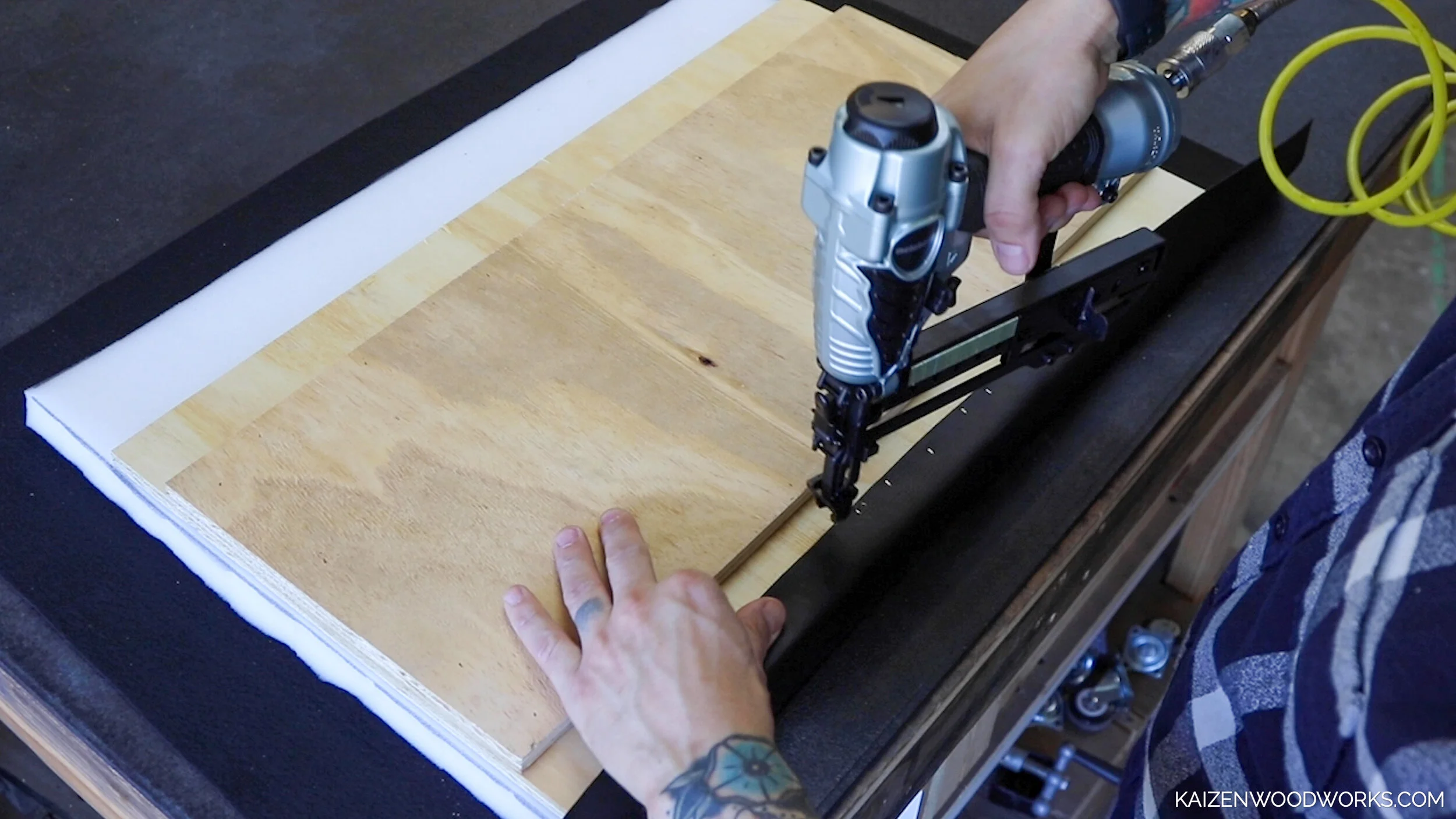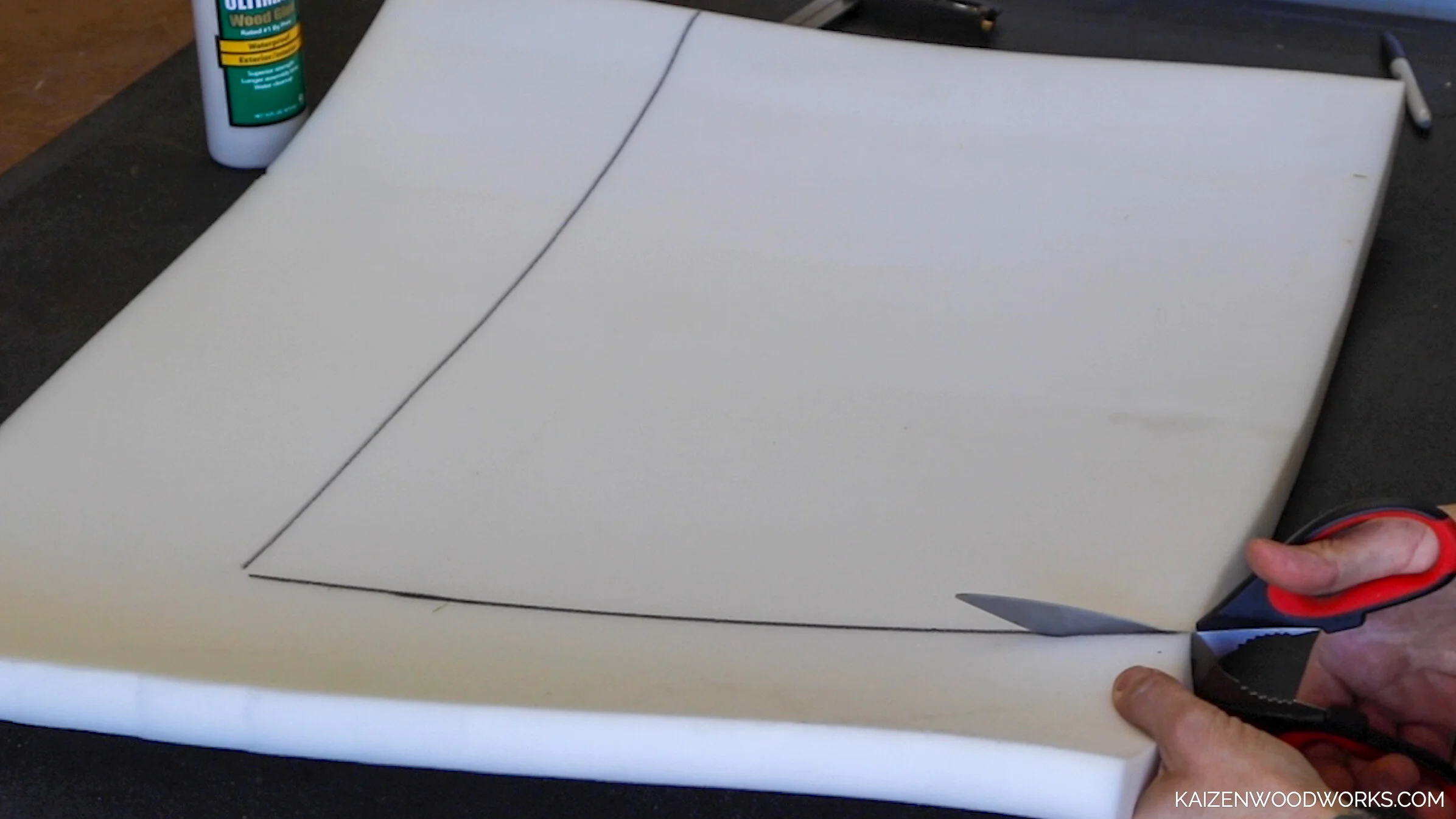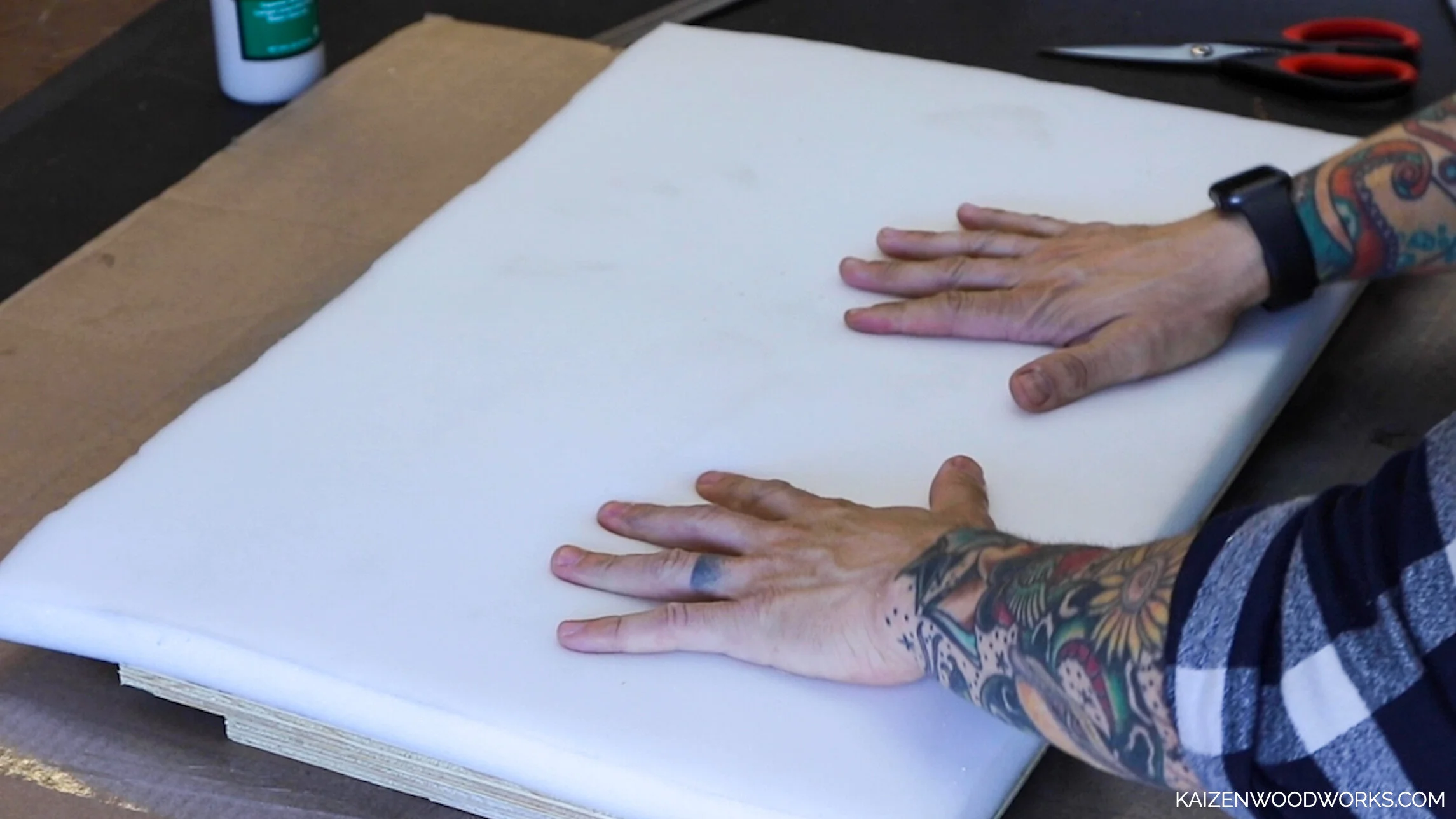 I leave a little extra padding to fold over the top where my arms will be resting. I spray my plywood with glue before putting the foam on.