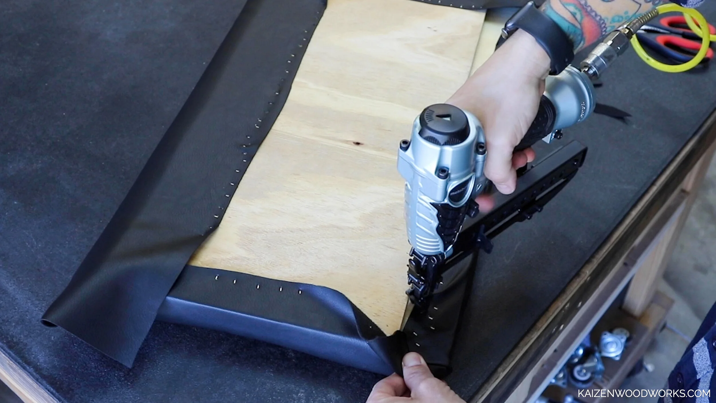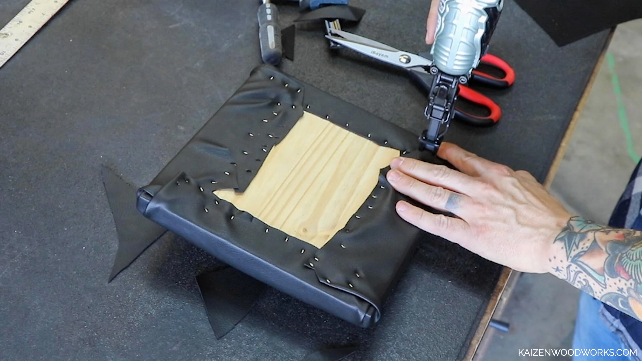 The main goal is to make sure everything is snug while you’re putting in the staples. The corners are a bit tricky but it really doesn’t have to be perfect. There are plenty of upholstery tutorials available if you want to learn more before attempting this. Anyway, despite my lack of experience, it turns out pretty good.